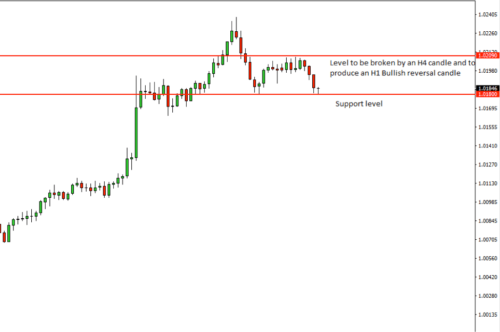 Have a look at the chart. The price was up trending. Then the H4 chart started having some correction. The level of 1.01800 seems to be a level of Double Bottom Support. If this level is held by the H4 candles and then it goes to make breakout at the level of 1.02090, then an H1 Bullish reversal candle would be the signal to take a long entry on the pair later today. Let us have a look at the summary of the trade…