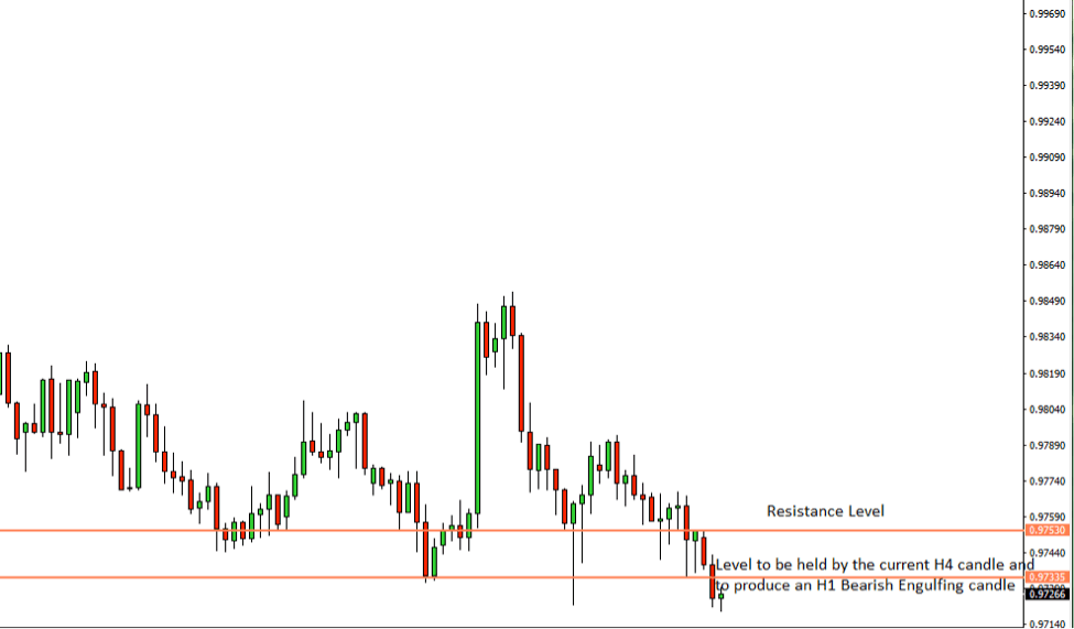 Have a look at the last two Bearish candles that were produced today. One of them made a breakout at the level of 0.97335. The current H4 candle seems to be making the correction. It has to be held at the breakout level. If the price goes up to the breakout level and produces an H1 Bearish Engulfing Candle within this H4 candle or bit later, then the price would reach 0.97000.