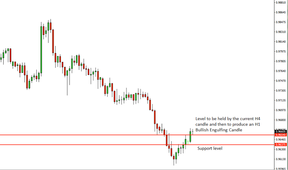 Have a look at today’s 2nd H4 candle, which made a breakout at 0.96540. The current H4 candle has been making a correction. If it is held by the breakout level and we get an H1 Bullish Engulfing Candle, then the price would reach 1.97000 without having too many pauses. Let us have a look at the summary of the trade…