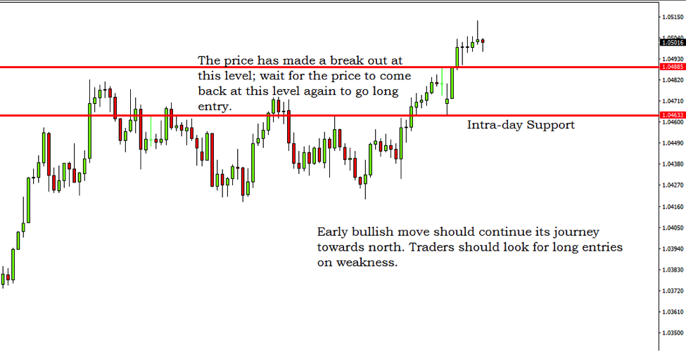 Here we have the hourly chart of AUDNZD. The price has broken the level of 1.04885. Moreover, it continued its bullish move for 2/4 hourly candles as well. The price seems to be getting ready for a correction. I assume the price would come back to the breakout level again. If we get an hourly reversal candle at the level of 1.04885, by setting our Stop loss below the level of 1.04633 and Take profit at the level of 1.05425, then buying the pair today would be the best option.