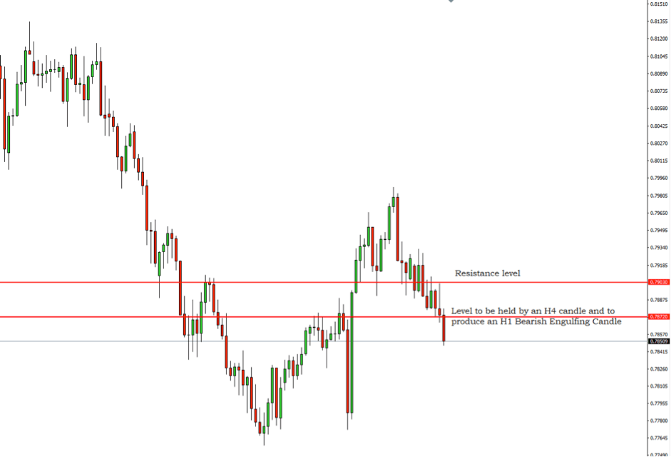 Have a look at the chart here. The price was having a correction on the H4 chart after being Bullish. However, the last H4 candle so far broke the level of 0.78720. This is not an H4 breakout yet since the candle is not finished, but surely it is an Hourly breakout. If the price now goes back to the breakout level and is held by the upcoming H4 candle, then we would have to wait for an H1 Engulfing Bearish Candle right at that level to go short on the pair later today. Let us have a look at the summary of the trade…