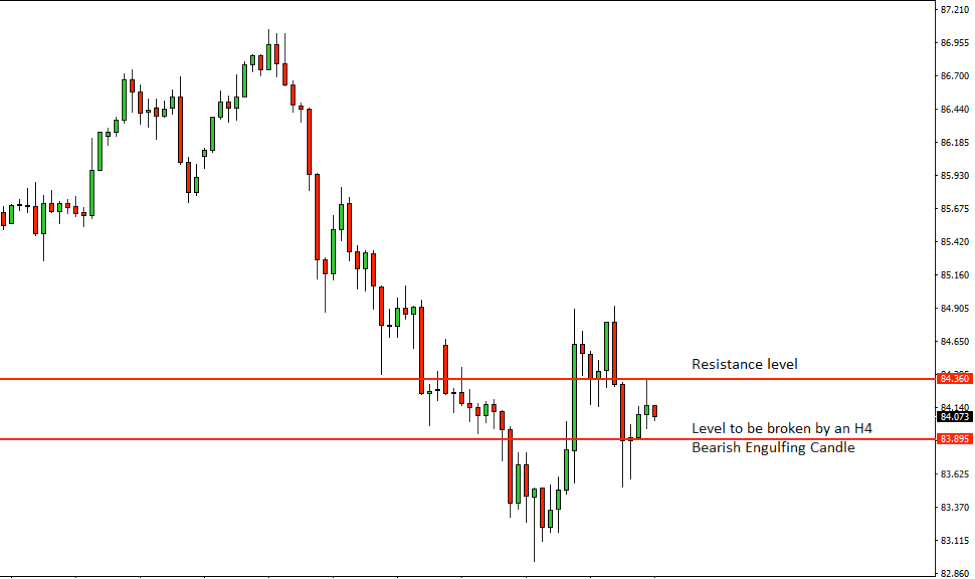 Have a look at those two H4 Bearish candles. Then, at the time of the correction, the price had a rejection from the level of 84.360. If the price goes back there again, and it produces an H4 Bearish Engulfing Candle breaching the level of 83.895, then selling the pair would get us green pips with an excellent risk and reward ratio. Let us have a look at the summary of the trade…