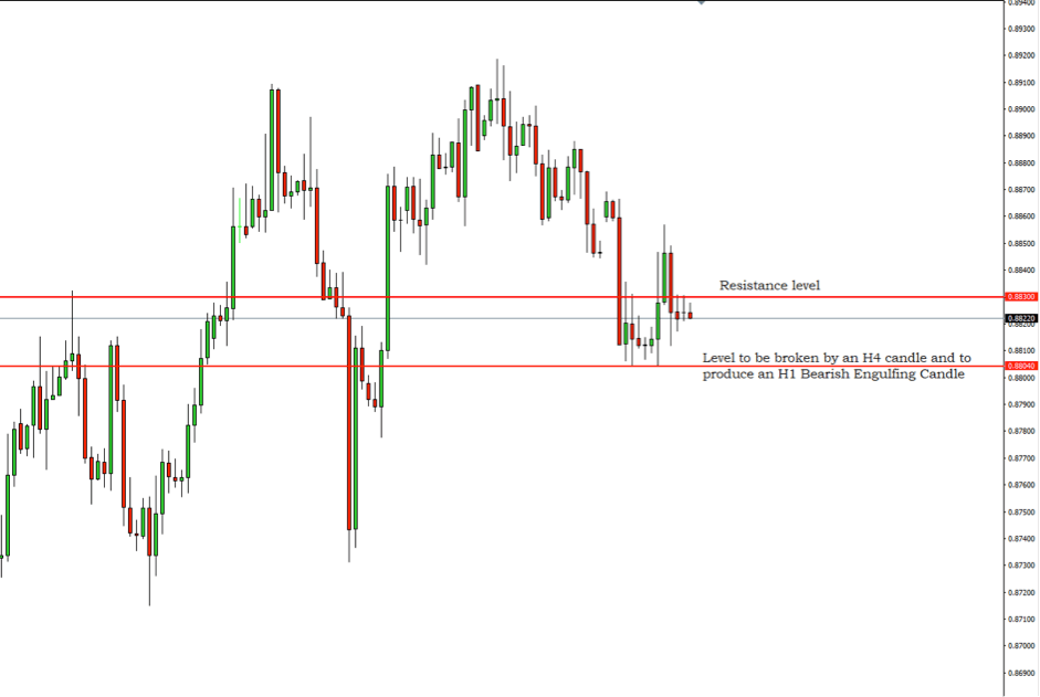 Have a look at the chart. After being Bullish the price had a rejection from a strong level of Resistance. It had a little upside correction and then seems to be Bearish again. Now we have to wait for a breakout. The nearest significant level of Support is at 0.88040. If this level gets broken by an H4 candle, and then we get an H1 Bearish Engulfing Candle right at that level, then the price should reach at 0.87630 without having that many pauses. Let us have a look at the summary of the trade…