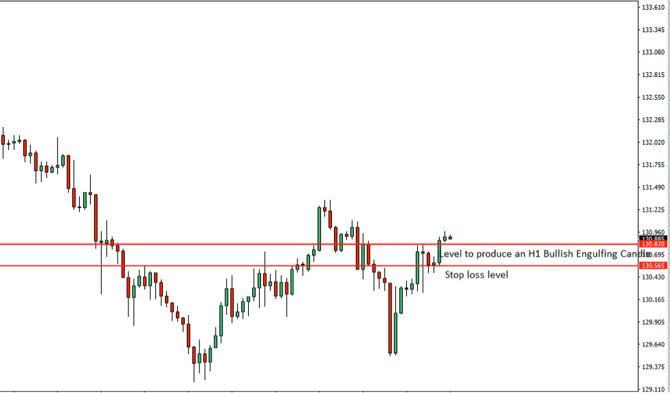 Have a look at the first H4 candle today. It came out as a solid Bullish candle, which made a breakout at 130.820. The next H4 candle has been held by the breakout level too. Now it is time for the price to come at the breakout level and to produce an H1 Bullish Engulfing Candle to offer the long entry. Let us have a look at the summary of the trade…