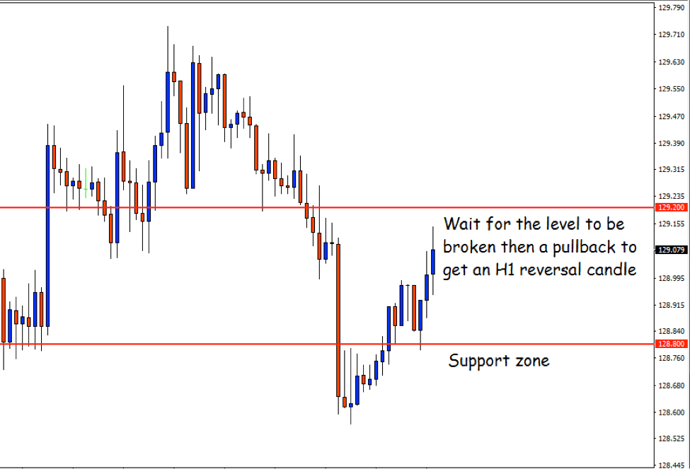 Have a look at the support zone where price reacted number of times. The price has been bullish after getting support from that zone as well. If it keeps going and makes a breakout at 129.200, then we should wait for a pullback right on that breakout level to get an H1 bullish reversal candle to take a long entry. Summary of the trade…