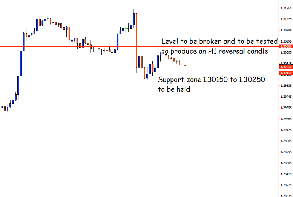 Have a look at the H1 chart where the price made an abrupt downside move. Since the overall trend is with bull, thus I am going to keep my eyes to take a long entry. Here the zone of 1.30150 to 1.30250 has the potential to be the support zone. If that really happens, then we will wait for an upside breakout at 1.30600. We do not buy on the breakout though, but we wait for the price to come back at the same level. If we get an H1 bullish reversal candle, then buying the pair would get us some green pips today. Summary of the trade…