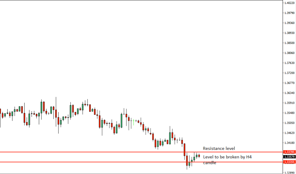 Today’s first two H4 candles were Bullish corrective candles. If the current candle comes out as a strong Bearish candle and makes a breakout at the level of 1.33355, then the H4 candle one after the breakout candle has to be held and an H1 Bearish candle has to be formed right at the breakout level to offer us the short entry. Let us have a look at the summary of the trade…