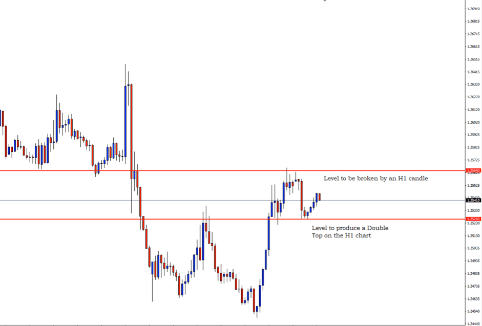 Have a look at the H1 chart here. The pair made some huge Bearish move and then it started going up. After finding a resistance at the level of 1.25640 it had a little pull back. The level of 1.25260 has come into play and made the price have a rejection already. It does not seem that the price would make a breakout on this ride. It would be a fragile breakout anyway. If the price comes back to the support level, and produces a Double Top and then makes a breakout at 1.25640, then buying the pair would get us some green pips with an excellent risk and reward ratio. Let us have a look at the summary of the trade…