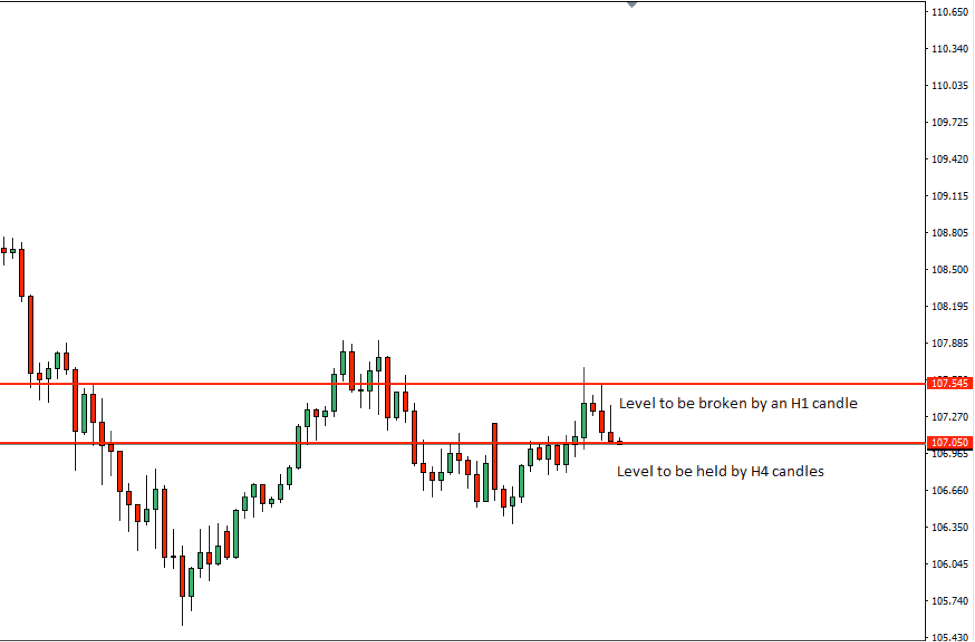 The level of 107.545 seems to be the Resistance here and the level of 107.050 is the Support. If the support level is held by the next H4 candle and the level produces an H4 Bullish reversal candle, then the buyers would wait for an H1 breakout at the level of 107.545 to take a long entry. There is enough room for the price to go towards the upside as well. This means the buyers could ride on the trend for a long time if they take out their partial profit. Let us have a look at the summary of the trade…