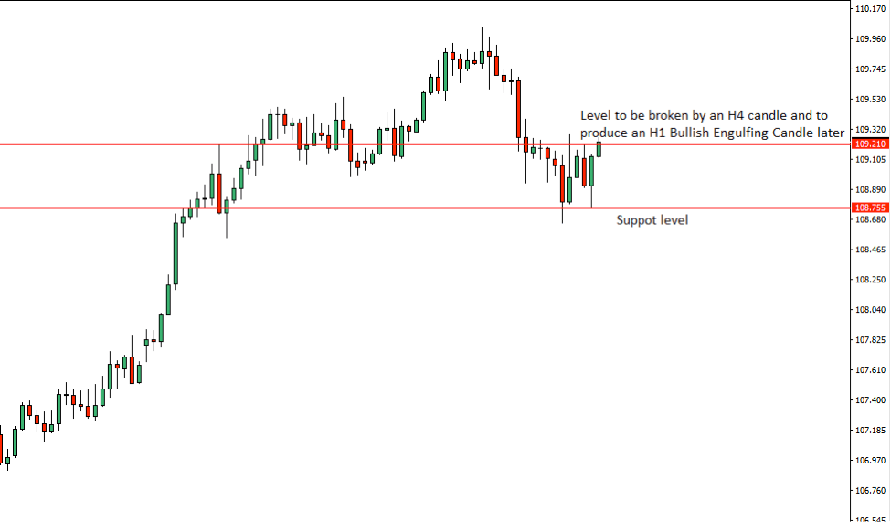 As we see on the H4 chart, the level of 108.755 has been working as the level of Support of a Double Bottom. If the level of 109.210 gets broken by the current H4 candle and it produces an H1 Bullish Engulfing Candle to finish off the corrective H4 candle, then the price would reach 110.000 without having that many pauses. Let us have a look at the summary of the trade…